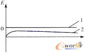 由式(5)可见,容积式流量计的误差特性仅与流量计内部的计量空间体积V0、仪表齿轮比常数a有关。也就是说,从测量原理的角度来说,容积式流量计的测量误差仅与流量计的几何结构有关,而与流体性质和流量值无关,我们把这个误差特性称为容积式流量计的理想误差特性。画成曲线,是一条平行于横轴的水平线,如图1中曲线1所示。