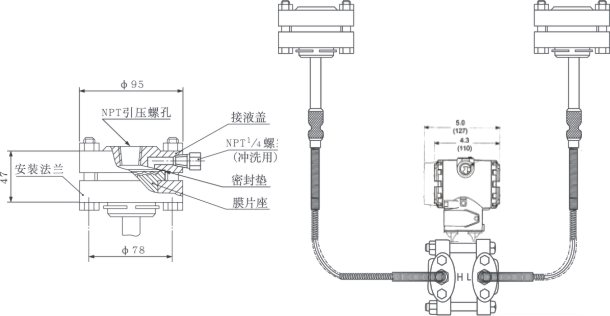 ⑤ DP型远传差压变送器两侧的毛细管最大长度为7.5米,两侧长度差为4.5米。