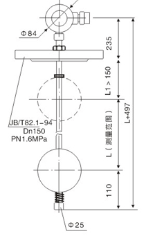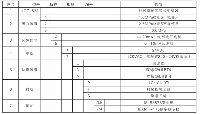 | ■选型举例:JD-UQZ-523-1AP/LB/M,磁性浮球顶装式变送器 压力:PN1.6Mpa 输出:4~20mA,远传装置 供电:24VDC,本安型 材质:1Cr18Ni9Ti 配安全栅和数字光柱显示表 |